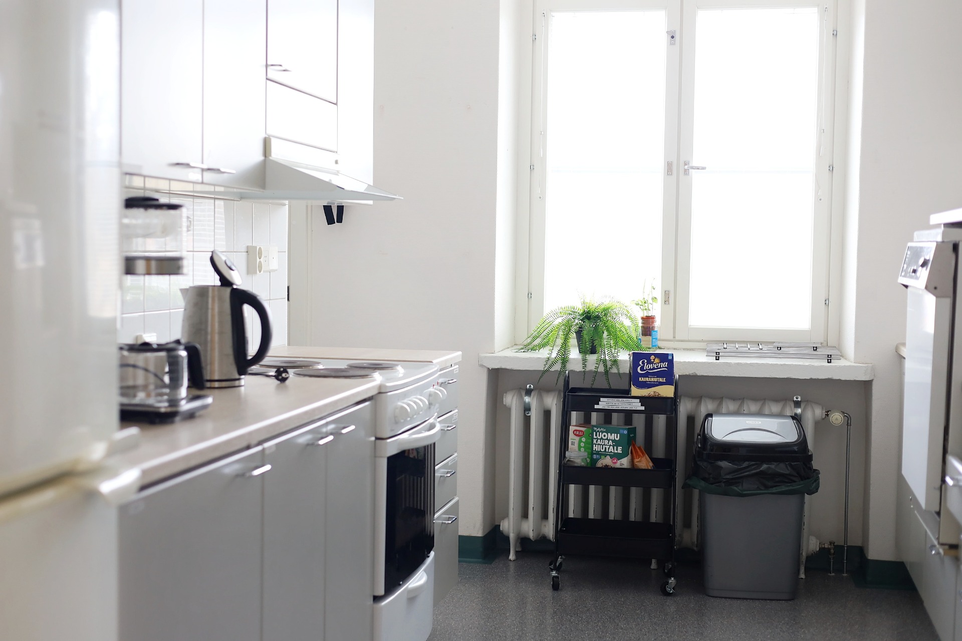 Talo tarjoaa luomu kahvia ja teetä, joita voit itse omatoimisesti keittää keittiössä, kun siltä tuntuu.